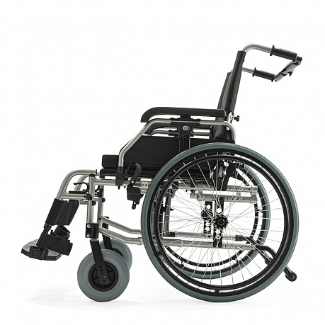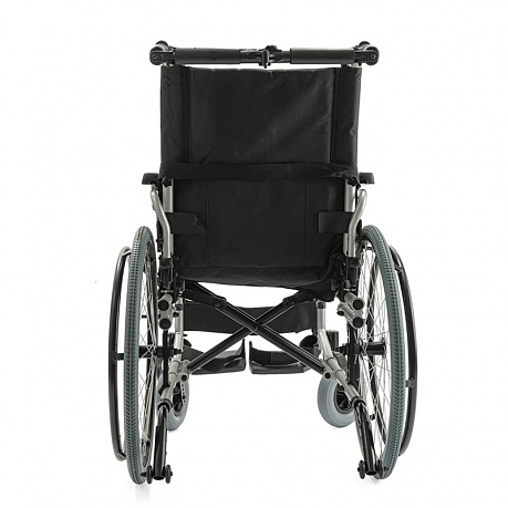 - Адаптивность под пользователя: ширина сиденья 46 см, глубина — 42-50 см, а съемные подлокотники с регулировкой по высоте позволяют идеально подогнать коляску под анатомические особенности и потребности пользователя.